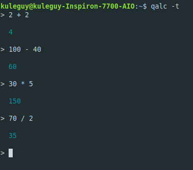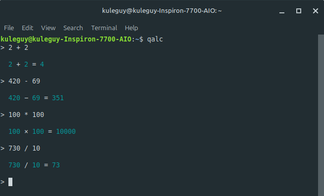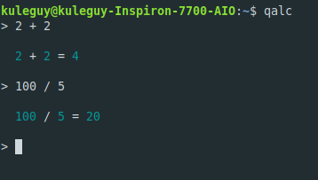 When I type "qalc" into the terminal, it gives me the > greater than arrow and when I enter in arithmetic operations like 2+2, it gives me 4; or 100 / 5 and it gives me 20.